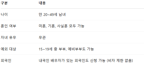 - 20~49세 남녀 모두 지원 가능 (미혼·사실혼·외국인 포함)