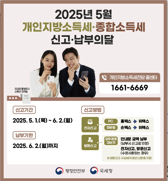 📅 2025년 종합소득세 및 개인지방소득세 신고 마감일은 6월 2일(월)입니다. 늦지 않게 지금 바로 확인하세요!