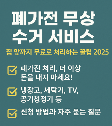 폐가전 처리, 더 이상 돈을 내지 마세요! 고장난 냉장고, 오래된 세탁기, 이제 쓰지 않는 TV나 공기청정기까지, 폐가전 제품을 처리하려면 비용이 만만치 않죠. 하지만 정부에서 제공하는 ‘폐가전 무상수거 서비스’를 이용하면 *전혀 비용 없이* 집 앞까지 와서 가전제품을 처리해줍니다. 이 글에서는 폐가전 무상수거 신청 방법과 자주 묻는 질문까지 상세하게 알려드립니다.