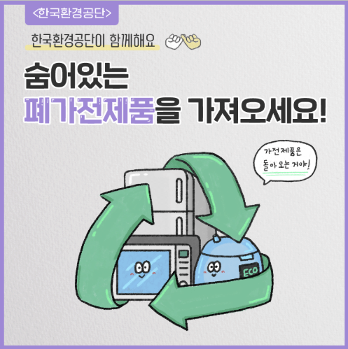 ‘e순환거버넌스’에서 운영하는 정부 인증 서비스로, 고장 난 중대형 가전제품을 무료로 수거해가는 서비스입니다. 정해진 조건만 맞추면 집 앞에서 직접 수거해주기 때문에, 스티커를 붙이거나 재활용장까지 가는 번거로움이 없습니다.